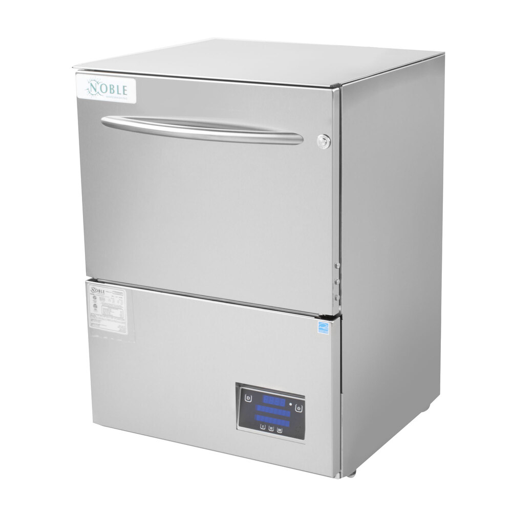 Efficiently clean up to 27 racks per hour using only 0.6 gallons of water per rack with the Noble Warewashing high temperature undercounter dishwasher.